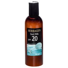 Lapte de Plaja cu Colagen Marin si Protectie Solara - Herbagen Sun Milk SPF20, 150 ml: contine colagen marin si filtre solare UVA si UVB ce asigura un bronz uniform si natural. Acest lapte de plaja protejeaza de actiunea razelor solare, mentinand elasticitatea si hidratarea optima a pielii. Colagenul marin este cunoscut pentru abilitatea sa de a ajuta la hidratarea si hranirea pielii. SPF 20 ofera o protectie moderata impotriva razelor ultraviolete ale soarelui. Utilizarea laptelui de plaja cu SPF 20 poate ajuta la prevenirea arsurilor solare. Produsul nu contine parabeni si parafine.