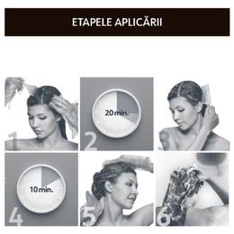 Mod de utilizare: nu spalati parul cu 48 ore inainte de vopsirea parului. Intre decolorarea sau ondulare/ indreptarea permanenta si vopsirea parului trebuie sa treaca minimum 15 zile. Se recomanda aplicarea vopselei pe tot parul daca este prima utilizare a unei vopsele permanente, sau daca urmele unei colorari anterioare nu mai sunt vizibile. Se utilizeaza intreg continutul tubului de vopsea si al flaconului de emulsie oxidanta (raportul de amestecare vopsea: oxidant este 1 : 1 - 50 ml : 50 ml), care se amesteca intr-un vas nemetalic pana la completa omogenizare si apoi se aplica pe parul uscat, conform instructiunilor din prospect. Se distribuie amestecul pe par, suvita cu suvita, de la radacini spre varfuri si apoi se uniformizeaza pe par, folosind un pieptene rar, de plastic. Amestecul se lasa sa actioneze 30 de min pe parul normal; 15-20 de minute pe parul cu fir subtire; 10-15 minute pe par decolorat sau ondulat permantent; 35-40 minute pe firul gros, sticlos, sau cu procent mare de fire albe. Nu se depaseste durata maxima recomandata. Dupa expirarea timpului, se umezeste parul si se maseaza aproximativ 1 minut, apoi se clateste cu multa apa, pana cand aceasta devine limpede.