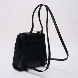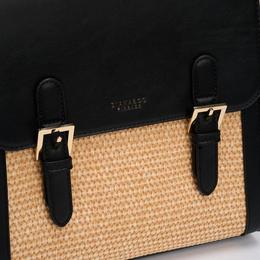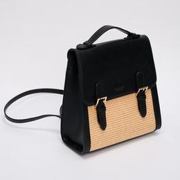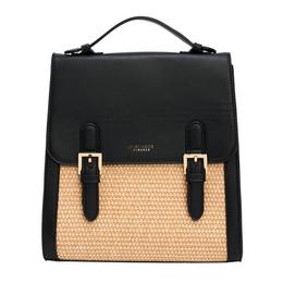 Geantă tip rucsac. Frontal imitație rafie. Închidere cu catarame și capse. Curele ajustabile. Mâner. Imitație piele ecologică netedă. Rucsac Negru Cu Catarame. Logo imprimat discret, frontal. Mărime medie. Capac uni.