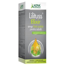 Sirop Fara Zahar, pentru Adulti - Adya Green Pharma Lilituss Elixir, 180 ml: supliment alimentar pentru adulti, ce poate contribui la buna functionare a cailor respiratorii si a aparatului respirator. Formula este special conceputa, fara zahar, pentru a se putea adresa si persoanelor cu glicemia crescuta. Elixirul se recomanda adultilor cu afectiuni ale tractului respirator care implica tuse seaca, iritativa, dar si tuse cu expectoratie (bronsite, traheobronsite, astm bronsic, raceala, gripa, pneumonie) sau orice conditie de natura sa afecteze sanatatea tractului respirator superior si inferior.