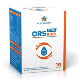 Supliment Alimentar ORSBleu Kids- Bleu Pharma, 10 plicuri: solutie de rehidratare orala pentru copii, care respecta recomandarile Organizatiei Mondiale a Sanatatii privind continutul de electroliti, glucoza si osmolaritate. Contine glutamina, un aminoacid esential pentru celulele intestinale si sistemul imunitar, si zinc, care contribuie la metabolismul acido-bazic normal si la functionarea sistemului imunitar.