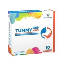 Supliment Alimentar TummyBleu Kids - Bleu Pharma, 10 plicuri: supliment alimentar destinat sustinerii digestiei si mentinerii echilibrului florei intestinale, atat la copii, cat si la adulti. Formula sa combina enzime digestive si probiotice, contribuind la un proces digestiv eficient si la o flora intestinala sanatoasa. Produsul este indulcit si contine indulcitor.