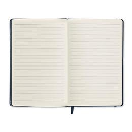 Agenda A5 cu coperta tare din PU. Bloc legat. 192 pagini liniate din hartie reciclata (96 file). Inchidere cu elastic si panglica de culoare asortata.