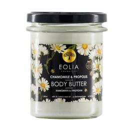 Unt de Corp Calmant cu Musetel, Propolis - Eolia Cosmetics Body Butter Chamomile & Propolis, 200 ml: unt de corp cu proprietati calmante si reparatoare, creat special pentru pielea sensibila, uscata sau iritata. Textura sa cremoasa si bogata se absoarbe usor si lasa pielea hidratata, neteda si vizibil mai sanatoasa. Formula contine extract de musetel, recunoscut pentru efectul sau antiinflamator si calmant, si propolis, un ingredient natural cu proprietati antibacteriene si cicatrizante. Uleiul de sunatoare contribuie la regenerarea tesuturilor si la reducerea disconfortului pielii, iar untul de shea si uleiul de masline hranesc si protejeaza pielea impotriva uscaciunii. Parfumul delicat si natural ofera o senzatie placuta si relaxanta, transformand aplicarea zilnica intr-un gest de ingrijire blanda si eficienta.