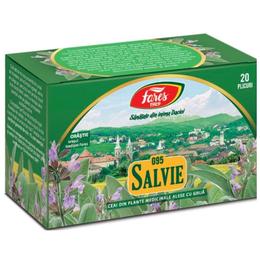 Ceai de Salvie G 95 - Fares, 20 plicuri: remediu traditional pe baza de plante, utilizat pentru sustinerea sanatatii cavitatii bucale, a gatului si a sistemului digestiv. Salvia are efect antiseptic, astringent si antiinflamator, fiind recomandata atat pentru uz intern, cat si pentru gargara sau spalaturi bucale. Este de ajutor in caz de transpiratie excesiva, disconfort digestiv, balonare sau tulburari menstruale. Acest produs contine exclusiv frunze uscate de salvie, recunoscute pentru proprietatile lor terapeutice.