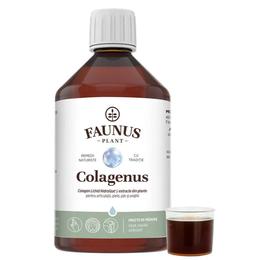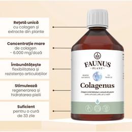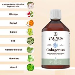 Colagen Lichid Hidrolizat si Extracte din Plante pentru Articulatii si Piele - Faunus Plant Colagenus, 500 ml: supliment alimentar lichid foarte concentrat, obtinut manual dupa o reteta exclusiva, formulat pentru sustinerea sanatatii articulatiilor, oaselor, muschilor, pielii, parului si unghiilor. Fiecare doza zilnica de 15 ml contine 6000 mg colagen hidrolizat tip I (Peptan) si 40 mg colagen nativ tip II (Collavant n2), completate de un complex fitoactiv din extracte de plante precum aloe vera, catina, hibiscus, macese, soc, coada-calului, salcie, enupar si menta, alaturi de vitamina C.
