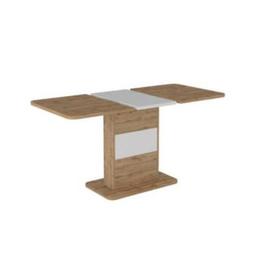 Masă de sufragerie extensibilă din MDF, culoare stejar, cu o bază stabilă.