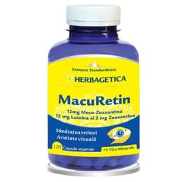 MacuRetin - Herbagetica, 120 capsule vegetale: supliment alimentar formulat pentru sustinerea sanatatii ochilor si protejarea retinei. Contine un complex sinergic de carotenoide (luteina, zeaxantina, mezo-zeaxantina), extracte din fructe de afin, mirt, goji si coacaze negre, precum si vitamine si minerale antioxidante cu rol esential in mentinerea acuitatii vizuale si in reducerea oboselii oculare. Recomandat persoanelor expuse prelungit la ecrane sau lumina artificiala.