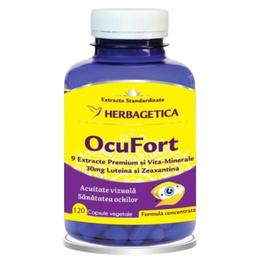 OcuFort - Herbagetica, 120 capsule vegetale: supliment alimentar natural, formulat pentru protectia si sustinerea sanatatii ochilor si a vederii. Contine un complex sinergic de antioxidanti, vitamine si extracte din plante, cu actiune benefica asupra retinei si circulatiei oculare. Ocufort poate contribui la incetinirea degenerarii maculare, la protejarea celulelor oculare impotriva stresului oxidativ si la mentinerea unei vederi clare, inclusiv in conditii de lumina slaba sau efort vizual prelungit.