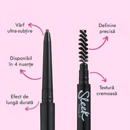 Creion pentru Sprancene - Sleek MakeUP Micro Fine Brow Pencil, nuanta Dark Brown, 0.063 g: creionul ofera definire precisa si aspect natural sprancenelor. Varful extra subtire permite trasarea unor linii fine, imitand firele naturale de par, pentru un look elegant si discret. Formula sa este imbogatita cu ceara vegetala, care hidrateaza sprancenele si le face mai matasoase. Creionul este rezistent la transfer, apa si transpiratie, asigurand o fixare de lunga durata, fara sa pateze. Include un capat cu perie pentru blenduire si un finisaj uniform. Nu necesita ascutire.