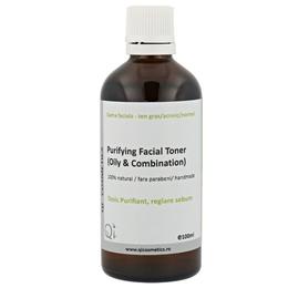 Un toner facial 100% natural, formulat special pentru tenul mixt, gras sau cu tendință acneică. Curăță delicat, dar profund, reglează secreția de sebum și calmează inflamațiile fără să usuce sau să irite pielea. Conține ingrediente bio precum apă florală de lavandă și rozmarin, otet de mere natural, niacinamidă și alantoină – o combinație care reduce imperfecțiunile, echilibrează pH-ul pielii și susține vindecarea naturală.