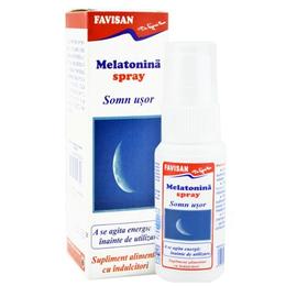 Melatonina Spray - Favisan, 30 ml: supliment alimentar sub forma lichida, cu administrare sublinguala, ce contribuie la reducerea timpului necesar pentru a adormi si la atenuarea efectelor neplacute ale decalajului de fus orar (jet lag). Formula cu absorbtie rapida asigura un efect eficient, ideal pentru persoanele cu tulburari de somn sau care calatoresc frecvent.