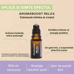 Roll-on Relax Bio - Pranarom Aromaboost Relax Roll-On, 5 ml: roll-on cu uleiuri esentiale, creat pentru a calma varfurile de stres intens. Formula sa unica, pe baza de uleiuri esentiale organice, ajuta la restabilirea unei stari de spirit pozitive, senine si relaxante in doar cativa pasi simpli. Imbogatit cu ulei esential de lavanda, ofera un suport imediat pentru reducerea simptomelor mentale si fizice asociate stresului.