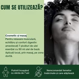 - masaj terapeutic - relaxare musculara si confort digestiv: amestecati 7 picaturi de ulei esential cu 50 ml de ulei de baza. Aplicati prin masaj bland, local, pe zona dorita: umeri, ceafa, spate sau abdomen. Rezultat: o stare de bine generala, muschi detensionati si digestie linistita.