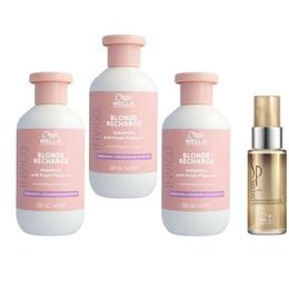 Pachet 3 x Sampon cu Pigment Violet pentru Neutralizarea Tonurilor de Galben - Wella Professionals Invigo Blonde Recharge, 300 ml + Ulei Reconstructiv 30 ml:
