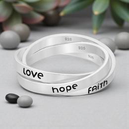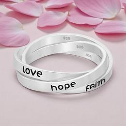 Inel din argint 925 cu 3 cercuri interconectate - mesaj simbolic „faith, hope, love”. Acest inel din argint 925 reprezintă o combinație perfectă între simbolism și eleganță. Modelul este format din trei cercuri interconectate, fiecare inscripționat cu mesajele „Faith”, „Hope” și „Love” – simboluri universale ale credinței, speranței și iubirii.