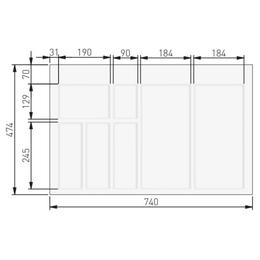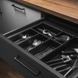 Maximizati spatiul sertarelor si eficienta in bucatarie cu ajutorul acestui organizator pentru tacamuri cu finisajul negru, prevazut cu 7 compartimente generoase, potrivit pentru sertare cu o inaltime interioara minima de 50 mm, o latime interioara cuprinsa intre 682 mm si 740 mm, si o adancime interioara intre 384 mm si 474 mm. Dimensiunile pot fi ajustate cu usurinta prin taiere.