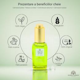 Serul cu extract activ de ceai verde de la Global Fashion este formulat special pentru tenul problematic, acneic, gras sau mixt. Acest elixir ușor, dar intens concentrat, luptă eficient împotriva principalelor cauze ale acneei și redă tenului claritatea, echilibrul și luminozitatea naturală.