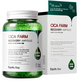 Ser Concentrat pentru Ten, Hidratant si Calmant cu Extract de Centella Asiatica - FarmStay Cica Farm Recovery Ampoule, 250 ml: serul concentrat este un tratament intens pentru regenerarea si calmarea pielii sensibile sau afectate de iritatii. Formula sa avansata, cu extract de Centella Asiatica (Cica), Madecassoside si pantenol, ajuta la refacerea barierei naturale a pielii, oferind un efect calmant imediat si o hidratare de lunga durata. Textura usoara, de tip gel, patrunde rapid in piele fara a lasa reziduuri lipicioase, redandu-i catifelarea si elasticitatea naturala. Utilizarea constanta contribuie la reducerea rosetii, uniformizarea tonului pielii si prevenirea aparitiei imperfectiunilor. Serul este ideal pentru pielea stresata, deshidratata sau predispusa la acnee, redand tenului un aspect sanatos, echilibrat si luminos.