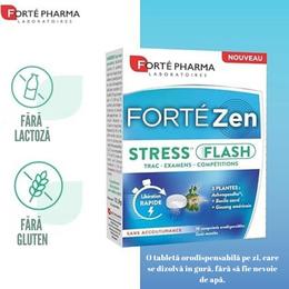 Supliment Alimentar pentru Echilibru Emotional - Forté Pharma FortéZen Stress Flash, 10 comprimate orodispensabile: formula inovatoare creata pentru a sustine echilibrul emotional si calmul mental in momentele solicitante. Ajuta la reglarea reactiilor organismului, favorizand starea de calm si increderea in sine si contribuie la functionarea normala a sistemului nervos si la mentinerea unei stari psihologice echilibrate. Contine un complex de plante si vitamine atent selectionate pentru a ajuta organismul sa gestioneze stresul ocazional si sa mentina claritatea mentala.