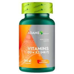 Vitaminele D3 + K2 (MK-7) - Adams Supplements, 90 capsule: ofera un suport complet pentru mentinerea sistemului osos, cardiovascular si imunitar. D3 ajuta la absorbtia calciului, iar K2 il directioneaza in oase. Sustine sanatatea oaselor si a dintilor, contribuie la absorbtia optima a calciului si a fosforului, sustine sistemul imunitar si muscular. Este ideal pentru prevenirea osteoporozei, sustinerea sanatatii osoase si cardiovasculare, persoane cu aport redus de vitamina D, persoane in varsta, femei post-menopauza, sportivi.