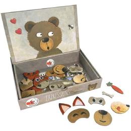 Copiii pot combina diferite elemente pentru a forma fețe de urs, vulpe, câine sau iepure, exprimând stări precum fericire, tristețe, curiozitate sau foame.