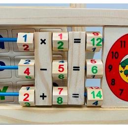 Deasupra tablei este un ceas din lemn, o numărătoare cu 30 biluțe și câteva cuburi din lemn imprimate cu cifre și semne matematice, cu care se pot forma operații matematice.