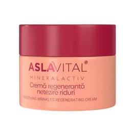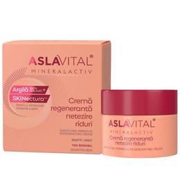 Crema Regeneranta de Noapte pentru Netezirea Ridurilor - Aslavital Mineralactiv SKINectura Smoothing Wrinkle Regenerating Cream, 50 ml: crema regeneranta cu argila naturala si SKINectura™ este conceputa special pentru netezirea ridurilor si refacerea fermitatii pielii sensibile. Formula avansata, imbogatita cu ingrediente active naturale, hraneste tenul in profunzime pe timpul noptii, accelereaza repararea celulara si imbunatateste densitatea pielii. Cu o textura lejera si confortabila, crema calmeaza, fortifica si ajuta la reducerea vizibila a liniilor fine, lasand pielea catifelata, supla si revitalizata la trezire.