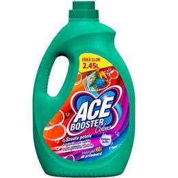 Solutie pentru Indepartat Petele de pe Hainele Colorate, fara Clor, Regular - ACE Booster Colors, 2450 ml: solutie puternica pentru indepartarea petelor de pe rufele colorate, formulata fara clor pentru a proteja culorile si tesaturile. Actioneaza eficient asupra petelor dificile, mirosurilor neplacute si murdariei, oferind rezultate vizibile chiar si la temperaturi scazute. Este potrivita pentru utilizare zilnica, atat in masina de spalat, cat si pentru pre-tratare, imbunatatind performanta detergentului si lasand hainele curate, proaspete si placut parfumate.