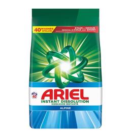Detergent Automat Pudra - Ariel Instant Dissolution Alpine, 40 spalari, 2.6 kg: detergent pudra premium pentru curatarea rufelor, conceput special pentru indepartarea petelor dificile si neutralizarea mirosurilor neplacute chiar si la 30°C. Formula sa eficienta patrunde rapid in fibra tesaturilor si actioneaza profund, oferind rezultate excelente chiar si in ciclurile scurte sau la temperaturi scazute. Parfumul fresh Alpine intensifica senzatia de curat si lasa rufele placut parfumate, in timp ce culorile si tesaturile sunt protejate spalare dupa spalare. Ideal pentru utilizare zilnica si compatibil cu orice tip de masina de spalat.