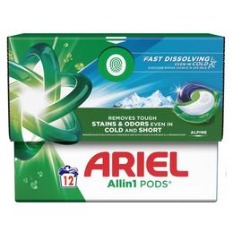 Detergent Automat Capsule - Ariel All in 1 Pods Alpine Fast Dissolving, 12 buc: capsule cu detergent automat concepute pentru a indeparta eficient petele dificile si mirosurile neplacute, chiar si in apa rece sau in cicluri scurte de spalare. Formula All-in-1 combina mai multe tehnologii de curatare intr-o singura capsula, oferind rezultate excelente dintr-o singura spalare. Designul multi-compartimente mentine ingredientele separate pana la momentul utilizarii, asigurand o actiune eficiente exact atunci cand este necesar. Invelisul capsulei se dizolva rapid si complet la contactul cu apa, fara a lasa reziduuri. Parfumul proaspat Alpine lasa rufele curate si placut parfumate dupa fiecare utilizare.