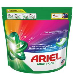 Detergent Automat Capsule - Ariel All in 1 Pods Color Fast Dissolving, 65 buc: capsule cu detergent de rufe cu putere ridicata de curatare, concepute pentru rezultate excelente chiar si la spalari in apa rece. Designul unic multi-compartimentat mentine ingredientele separate si stabile pana in momentul spalarii, oferind o formula extrem de concentrata in doza optima pentru fiecare spalare. In contact cu apa, pelicula capsulei se dizolva rapid si complet, eliberand tehnologiile active care indeparteaza eficient o gama larga de pete. Ariel All in1 Pods Color Fast Dissolving asigura rufe curate dintr-o singura spalare, protejand si improspatand culorile.