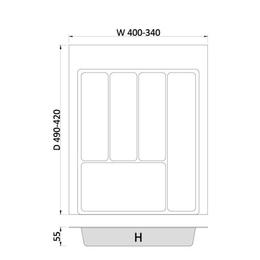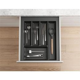 Conceput pentru sertarele cu latimea exterioara de 450 mm, modelul se potriveste sertarelor cu adancimea de 450–500 mm. Datorita designului flexibil, acest suport de organizare pentru tacamuri poate fi ajustat cu usurinta, marginile se pot taia astfel incat dimensiunile sa se potriveasca in intervalul 400–340 mm si 490–420 mm. Astfel, produsul se adapteaza chiar si mobilierului realizat pe masuri speciale.